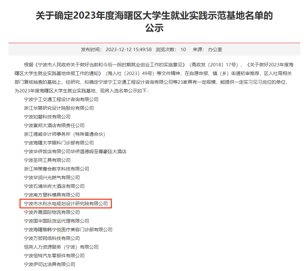 發(fā)布日期:2023.12.21 近日,根據(jù)《寧波市人民政府關(guān)于做好當(dāng)前和今后一段時(shí)期就業(yè)創(chuàng)業(yè)工作的實(shí)施意見(jiàn)》(甬政發(fā)〔2018〕17號(hào))、《關(guān)于做好2023年度海曙區(qū)大學(xué)生就業(yè)實(shí)踐基地申報(bào)工作的通知》(海人社〔2023〕... -