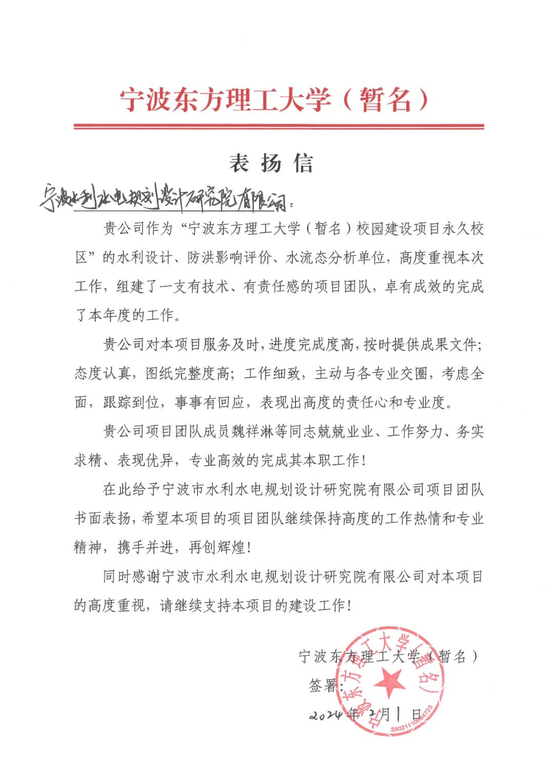 憑借上述三個(gè)重大項(xiàng)目中的出色表現(xiàn),我院分別收獲來自寧波市水利局、寧波東方理工大學(xué)和龍游縣林業(yè)水利局發(fā)來的感謝信。這不僅是對(duì)我院專業(yè)能力和敬業(yè)精神的高度認(rèn)可,更激勵(lì)著我院在未來持續(xù)奮進(jìn),為更多項(xiàng)目貢獻(xiàn)力量。