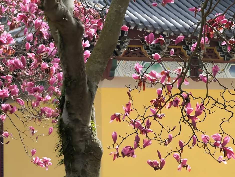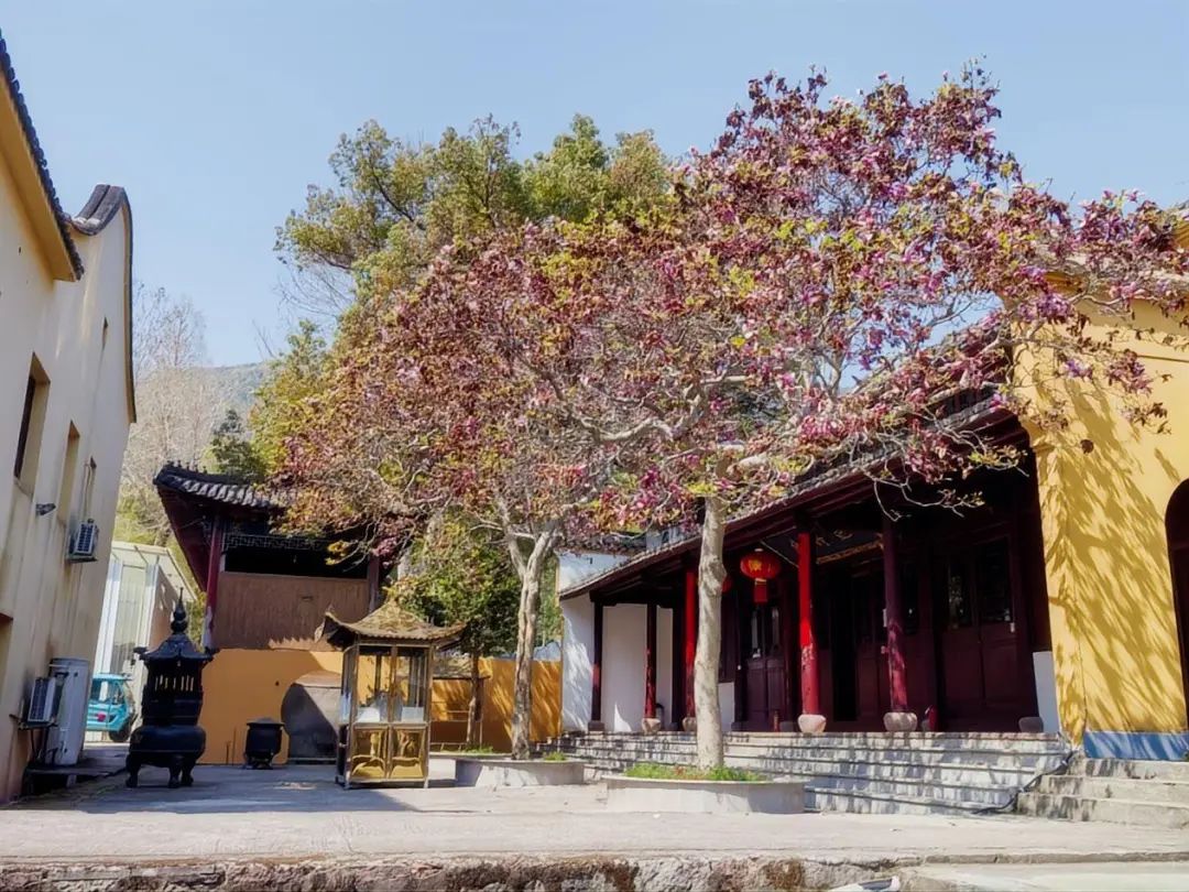 早上8:45,大巴準(zhǔn)時(shí)從園區(qū)啟程,在陽(yáng)光明媚中駛向?qū)幉ㄏ笊綁︻^鎮(zhèn)舫前村。抵達(dá)智門禪寺時(shí),茶園環(huán)繞,竹海綿延,百年紫玉蘭正值花期。大家或駐足欣賞古剎花影,或在禪寺咖啡館品鑒特色飲品,于傳統(tǒng)與現(xiàn)代交融中開啟這一天的芳菲之旅。