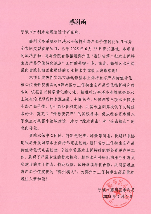 鄞州區(qū)水利局在感謝信中特別指出,我院提供的技術(shù)支持不僅專業(yè)高效,更體現(xiàn)了強(qiáng)烈的責(zé)任意識和服務(wù)意識。信中高度贊揚(yáng)了水保中心團(tuán)隊,特別是張濤、邱豪等同志,在相關(guān)工作中展現(xiàn)的嚴(yán)謹(jǐn)務(wù)實(shí)的工作作風(fēng)、精益求精的專業(yè)態(tài)度,以及不辭辛勞的奉獻(xiàn)精神。這份肯定不僅是對項目組的褒獎,更是對我院全體職工莫大的鼓舞和激勵。
