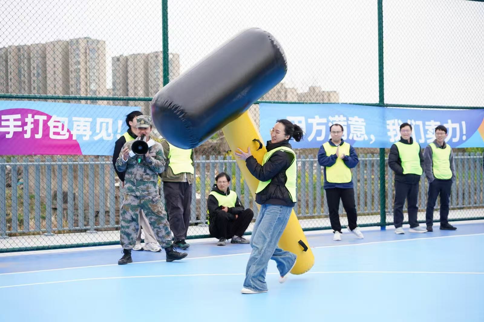 在“南水北調(diào)”項目中,隊員們手持PVC管接力運水,5分鐘內(nèi)爭分奪秒,讓水流在管中傳遞涌向重點,仿佛將團隊的信任與責任匯聚成河。“龜兔賽跑”則讓隊員們化身可愛的“烏龜”和“兔子”,在賽道上你追我趕,妙趣橫生。“鴻運亨通”需要8人共同托舉大球折返跑,大家步調(diào)一致,齊頭并進。“一錘定音”環(huán)節(jié),隊員們揮動充氣大錘敲破氣球,每一聲“砰”響都引來陣陣喝彩。