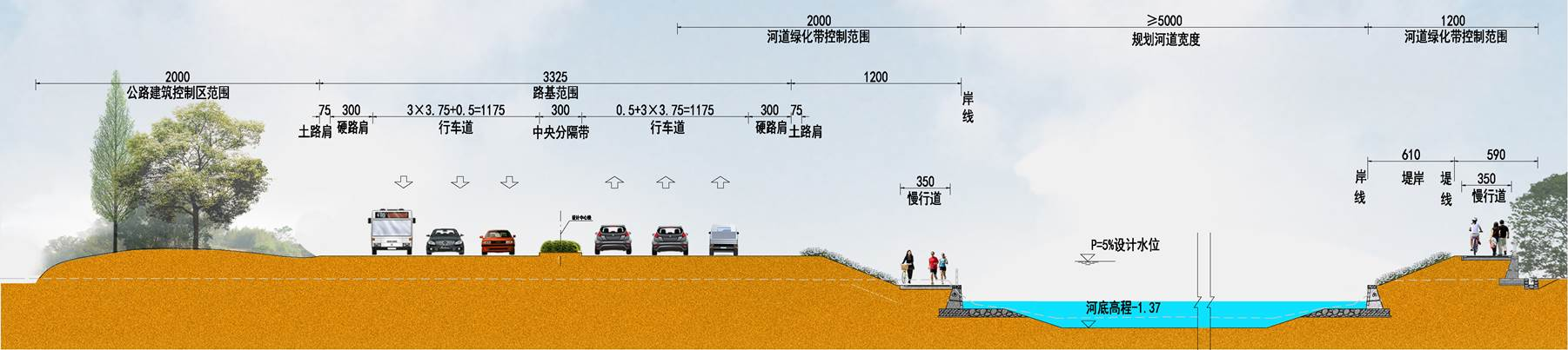 工程位于海曙區(qū)西側(cè),南起鄞江,北至姚江,為實現(xiàn)對海曙西側(cè)山區(qū)洪水的攔截,共整治河道長24km,建設(shè)閘站40座,閘門總凈寬554m,泵站22m3/s,改建新建橋梁42座。其中有3.5km與G228國道并線,為協(xié)調(diào)國道與河道之間用地布局,通過優(yōu)化河道斷面型式和堤線線位,實現(xiàn)了對土地的集約利用,打造一條海曙西部交通和河道的靚麗風(fēng)景線。