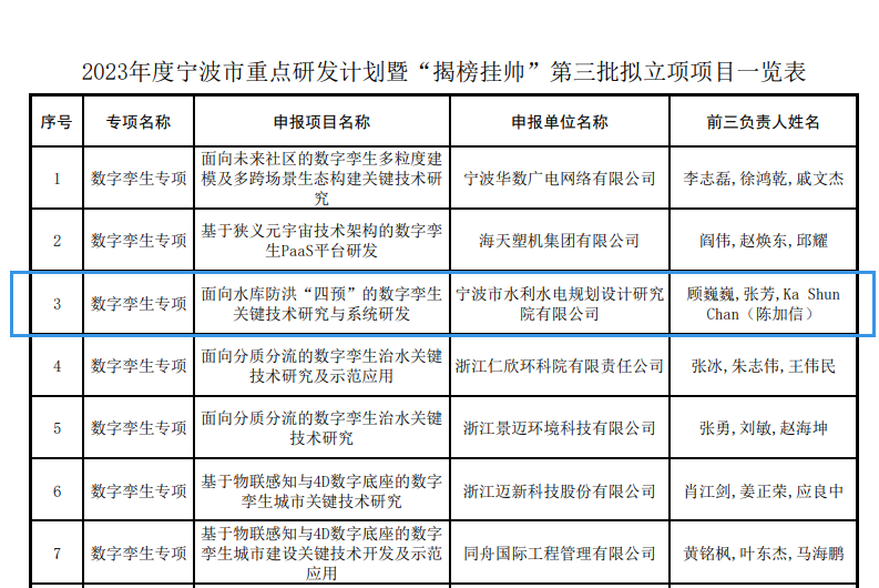 近日,2023年度寧波市重點(diǎn)研發(fā)計(jì)劃暨“揭榜掛帥”第三批擬立項(xiàng)項(xiàng)目公示,我院“面向水庫(kù)防洪‘四預(yù)’的數(shù)字孿生關(guān)鍵技術(shù)研究與系統(tǒng)研發(fā)”項(xiàng)目成功上榜。