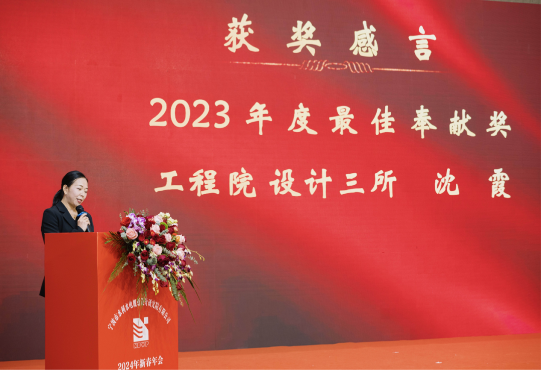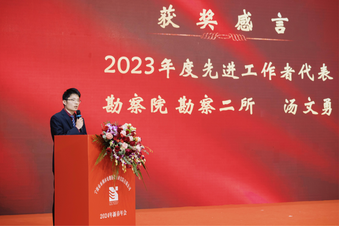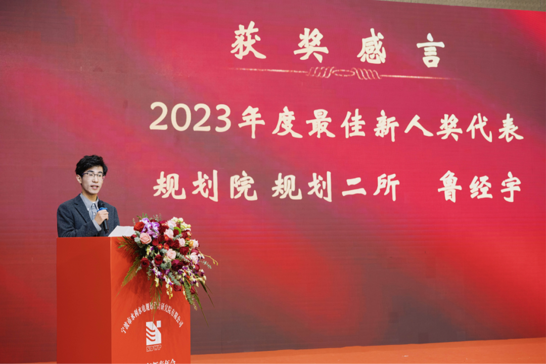 2023年度先進工作者獲獎代表勘察院勘察二所的湯文勇、2023年度最佳奉獻獎獲獎者工程院設計三所的沈霞、2023年度最佳新人獎獲獎代表規(guī)劃院規(guī)劃二所的魯經(jīng)宇,先后上臺發(fā)表獲獎感言,以真摯的情感、質樸的語言和滿滿的憧憬,表達了自己與企業(yè)共同成長過程中的勵志故事和切身感悟,表達了寧波院中堅力量、團隊骨干和新兵后輩的豪情壯志。